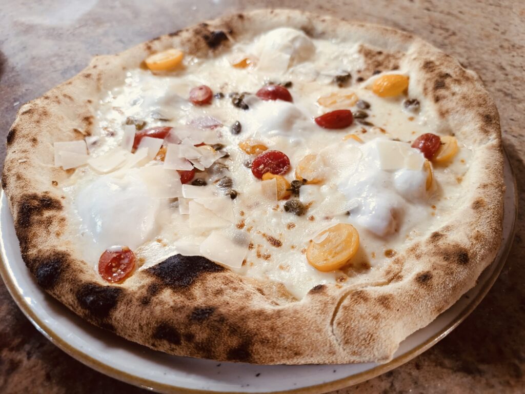 (pomodoro San Marzano D.O.P, fior di latte, datterini gialli, mozzarella di bufala,in uscita dal forno ,Crudo di San Daniele ,olio, basilico)