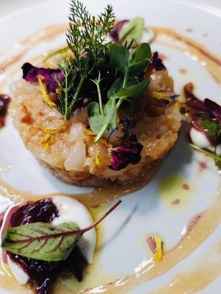 Tartare di Gambero Rosso di Sicilia con gelatina al Campari, Mousse di Caprino e Cipolla Caramellata
