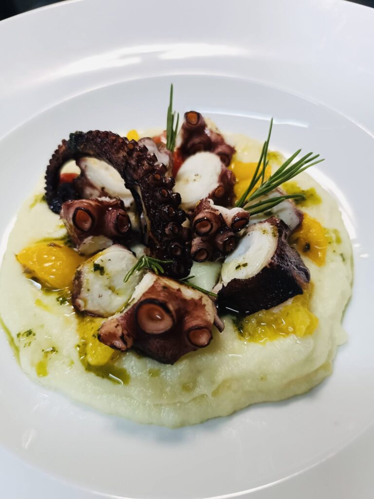Polpo arrosto su cremoso di patate ,gocce di basilico e couline di pomodorini conffit