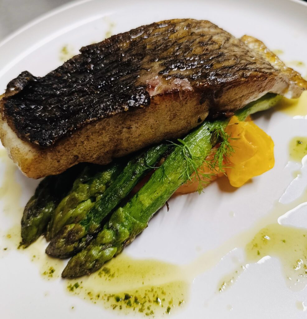 Trancio di Ombrina bocca d'oro, cremoso di patate dolci, il verde dell' Asparago con il pomodoro confit