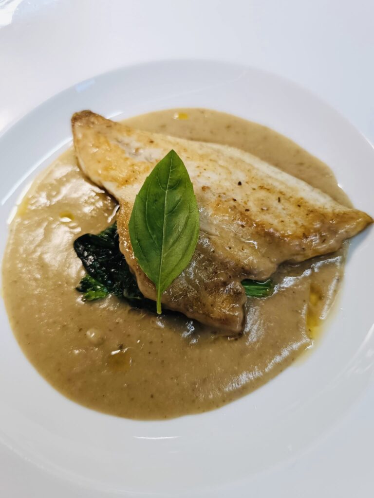 Filetto di Orata con Salsa di Grissino e Spinacino croccante