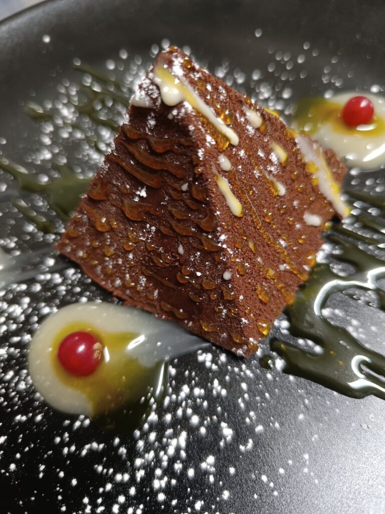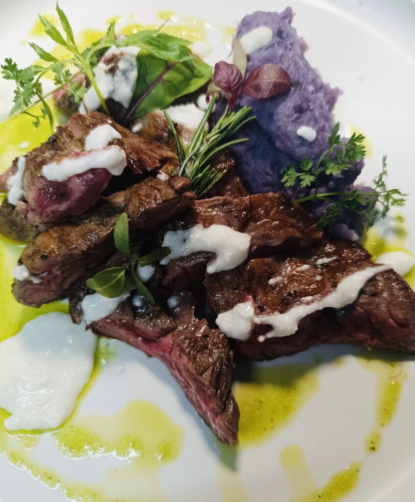 Lombatello di Black Angus con cremoso di patate viola ,gel all' olio di sedano ,ed il profumo di mandorle