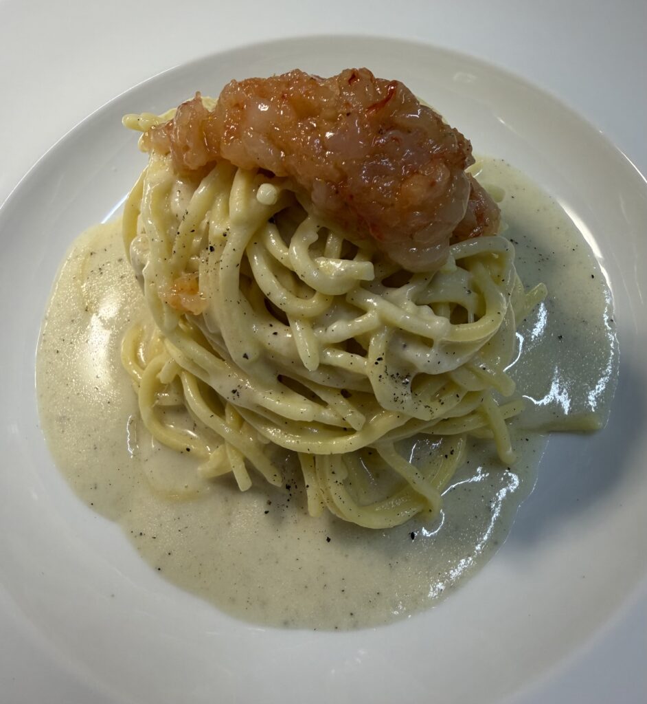 Tonnarelli Caccio e Pepe con tartare di Gambero rosso di Sicilia