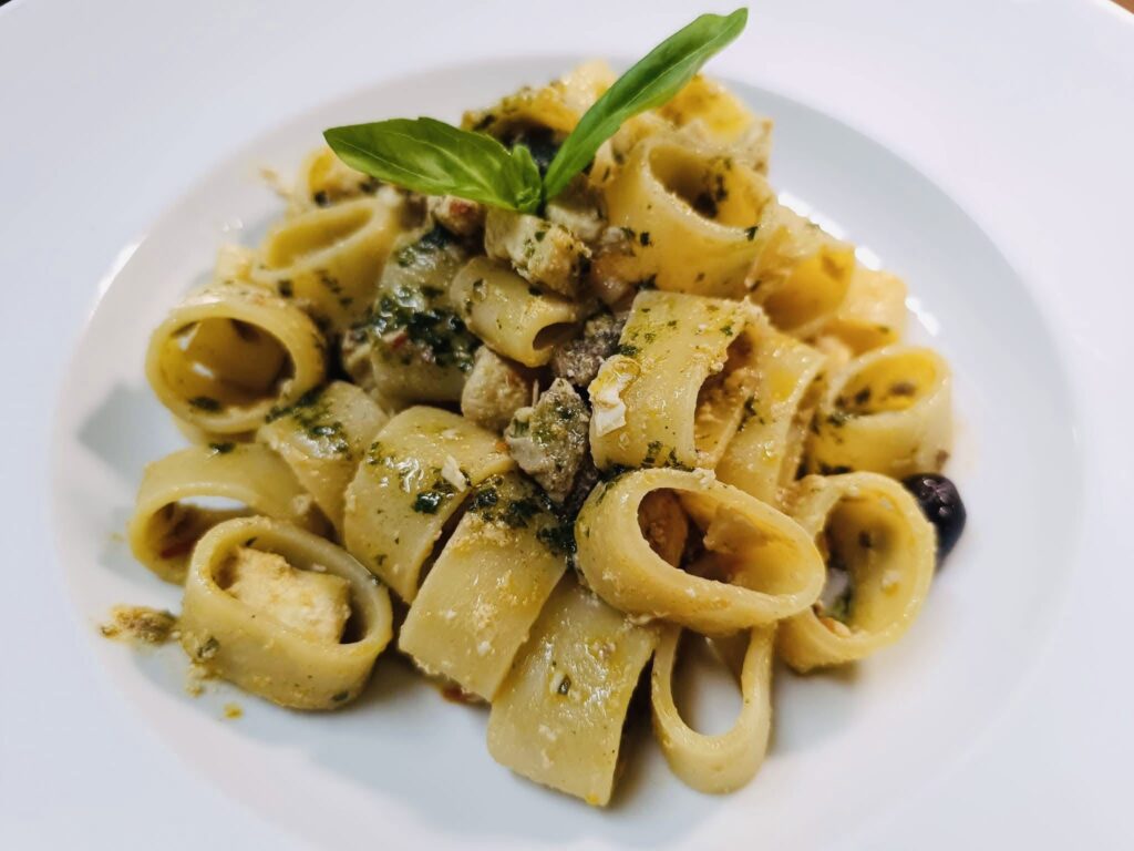 Calamarata con tris di pomodorini di pachino, Pesce Spada Fao Mediterraneo, olive nere ragusane profumate alla zagara