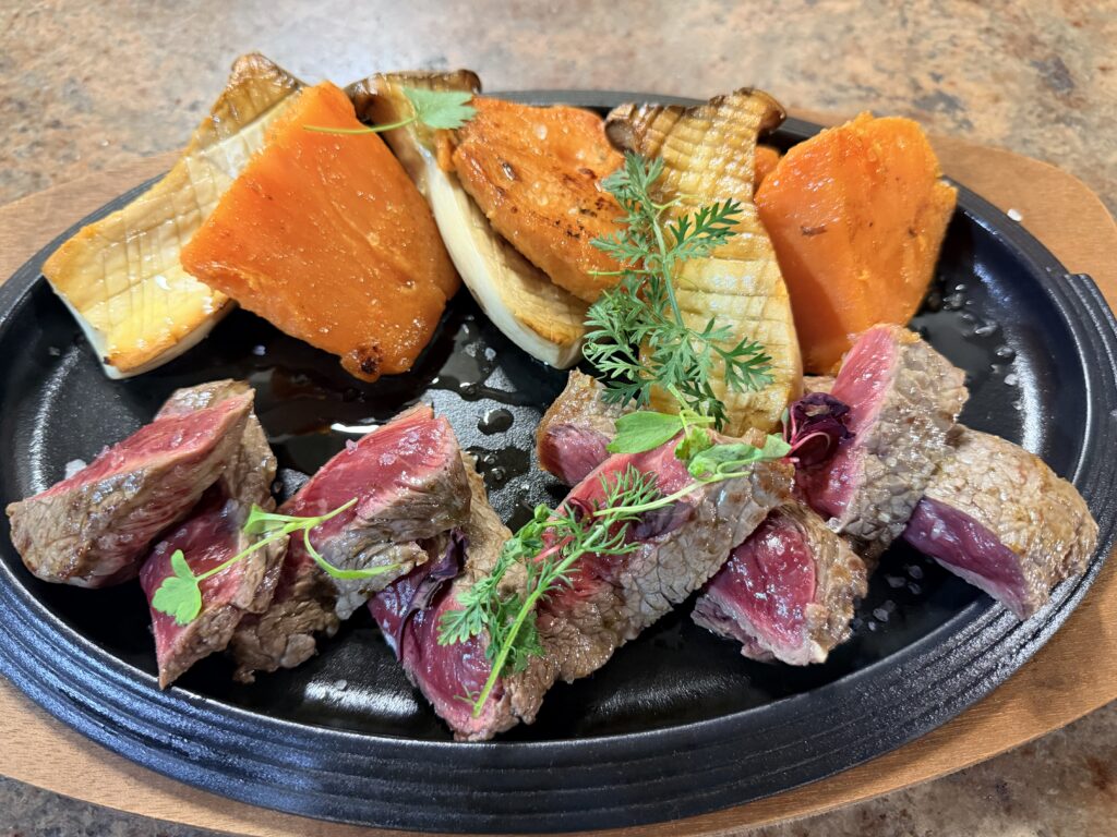 Tagliata di Pezzata Rossa , baguette di patate dolci agli aromi e funghi cardoncelli al profumo di sottobosco
