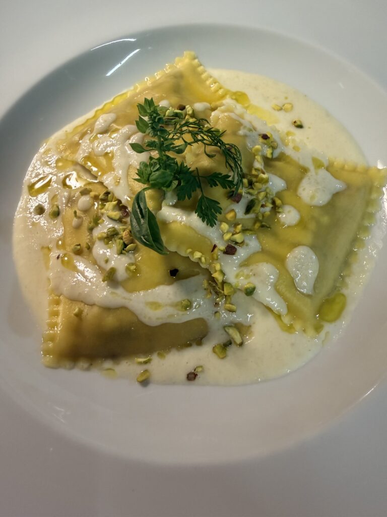 Ravioloni con Radicchio Tardivo e formaggio Asiago su specchio di parmigiano e granella di pistacchio