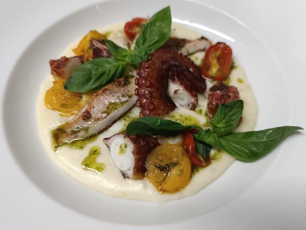 Polpo arrosto su cremoso di patate ,gocce di basilico e couline di conffit