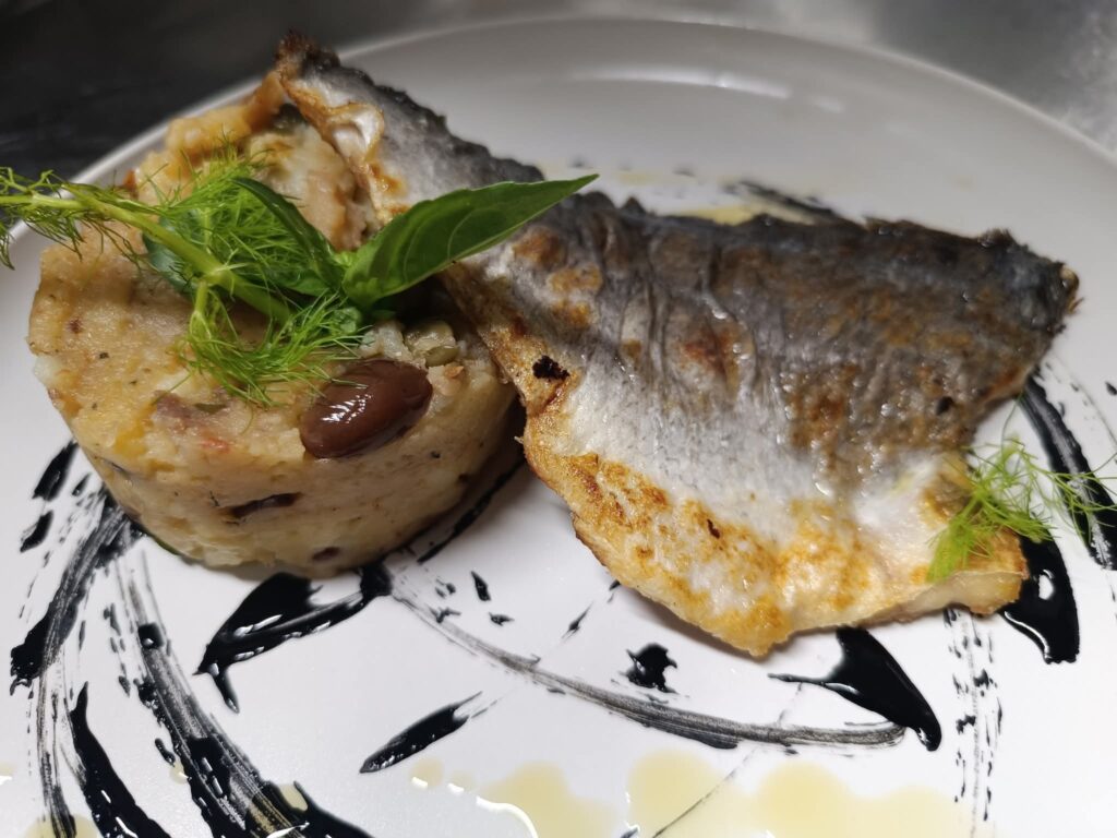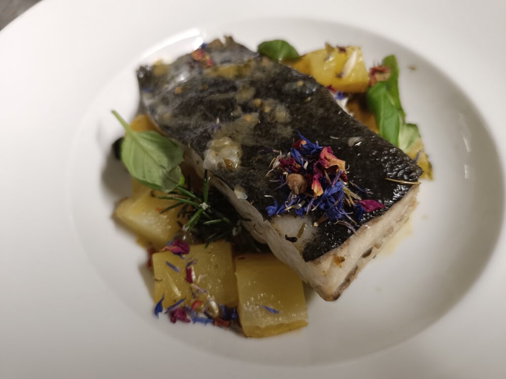Trancio di Ricciola , rondo di patata arrosto e Caponatina dell' Orto