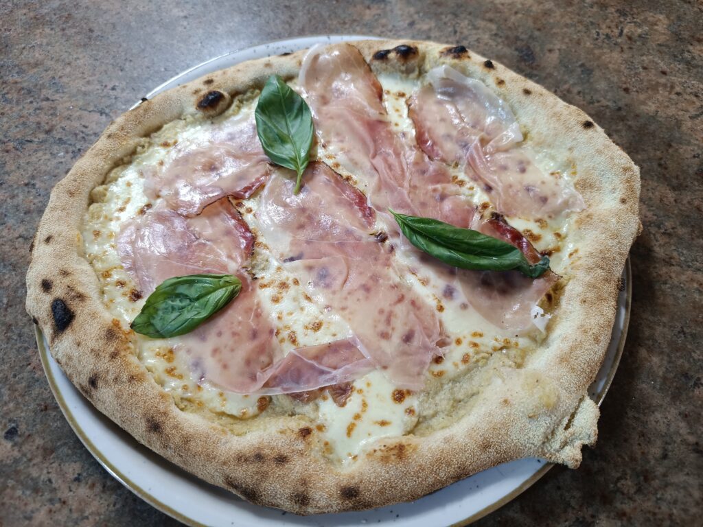 (fior di latte , crema di carciofi , speck di Sauris Wolf , spolverata di grana ,olio , basilico )