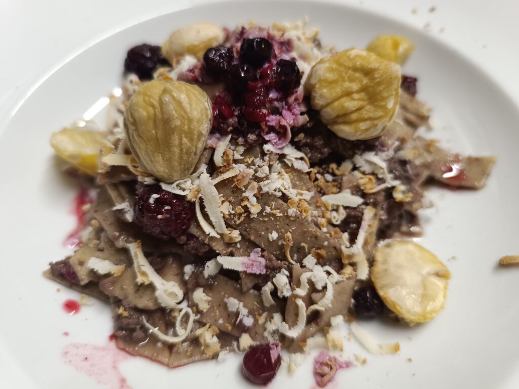 Blecs di grano saraceno con ragu di Cervo , frutti del bosco , castagne e trucioli di ricotta affumicata